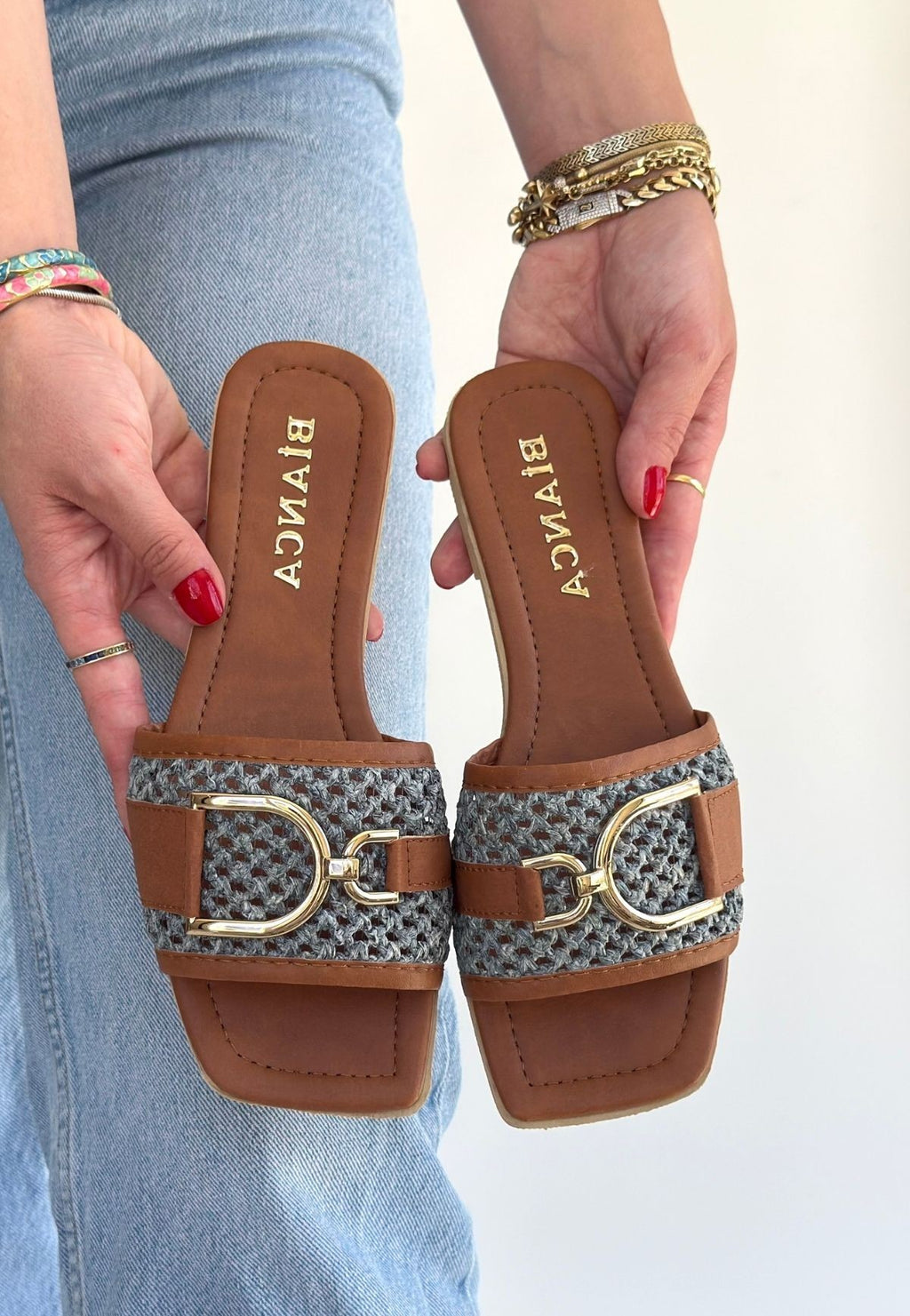Pıer Kadın Taba Gri Hasır Dokulu Tokalı Terlik