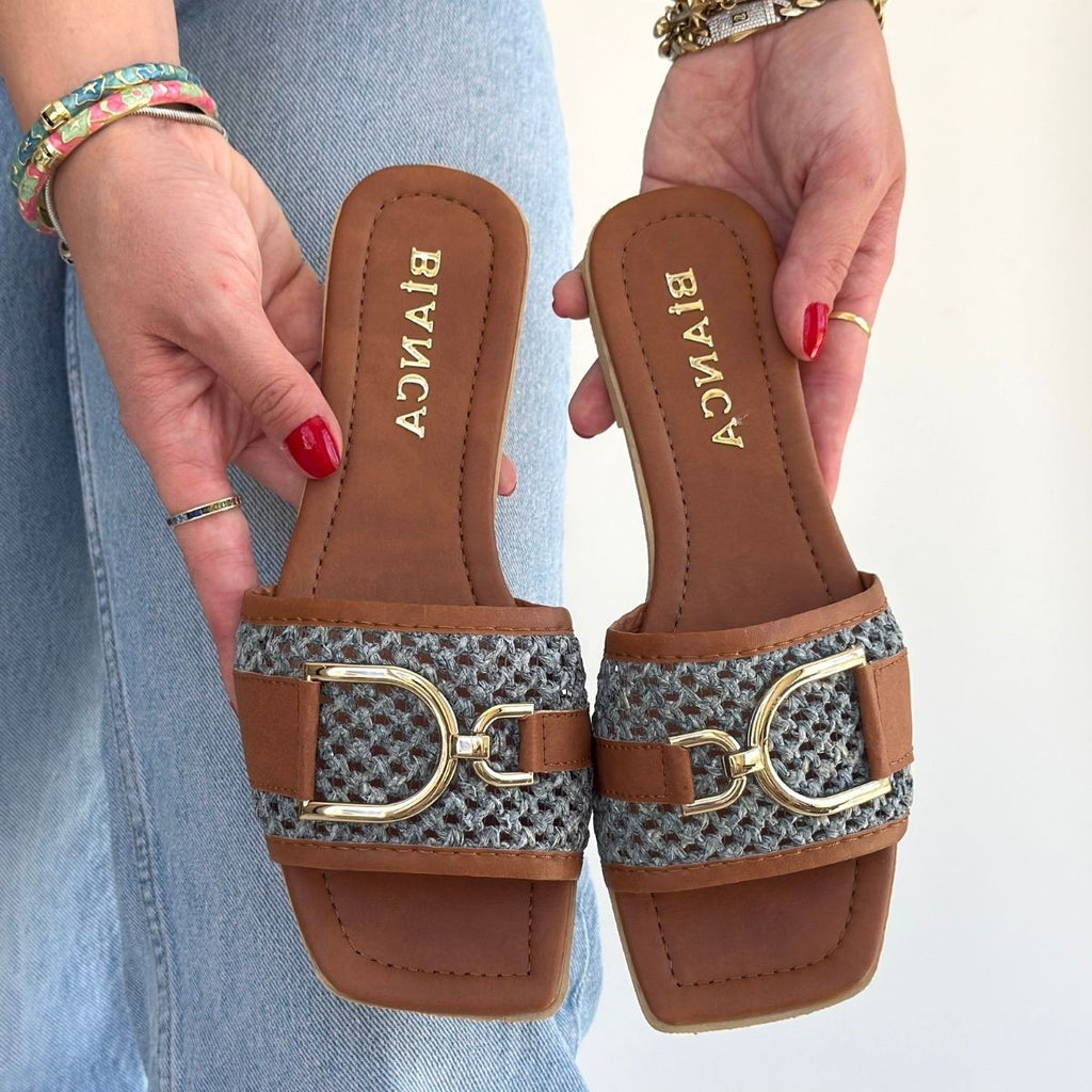 Hasır dokulu bant tasarımı ve gold toka detayıyla dikkat çeken Pıer modeli, sade formu güçlü bir stil vurgusuyla tamamlar. Kontrast geçişli yüzey yapısı modele hareket kazandırırken ince taban formu hafif ve dengeli bir kullanım sunar. Modern ve zamansız görünümü sayesinde farklı kombinlere kolayca uyum sağlar.