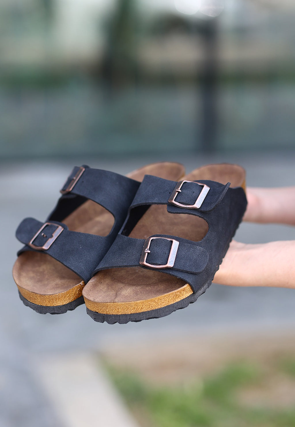 Rıno Kadın Siyah Nubuk Kemerli Terlik