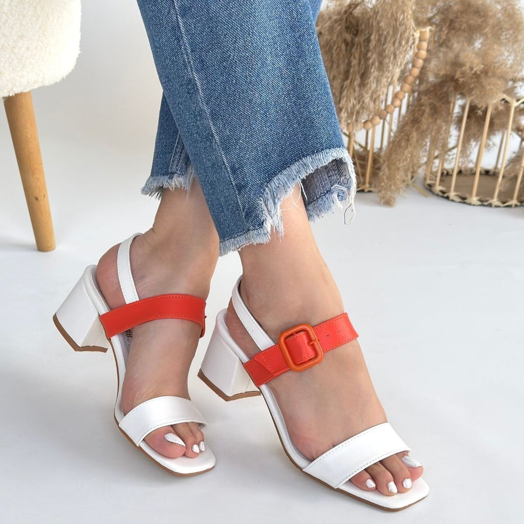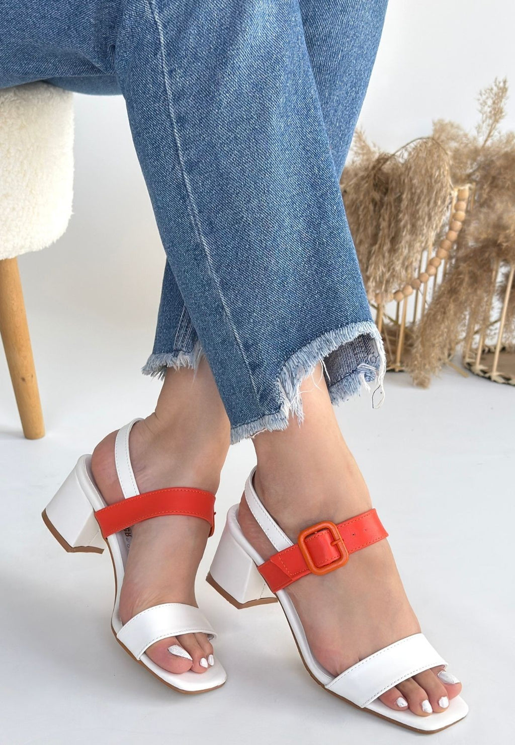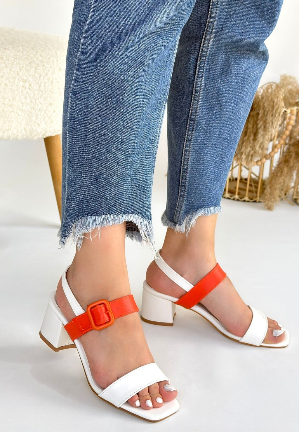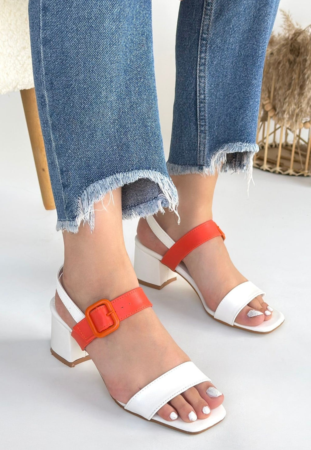 Year Kadın Beyaz Turuncu Kemerli Topuklu Sandalet